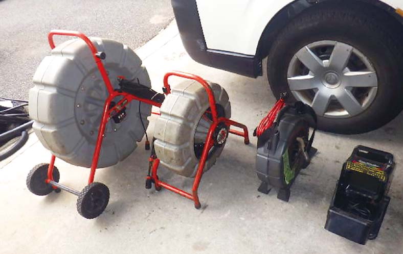 ケーブルマシンφ6~18mm用。ケーブルの先端にカッターが付いていて、口径に合わせてカッターを使い分けます。配管長さ100mまで対応可能です。